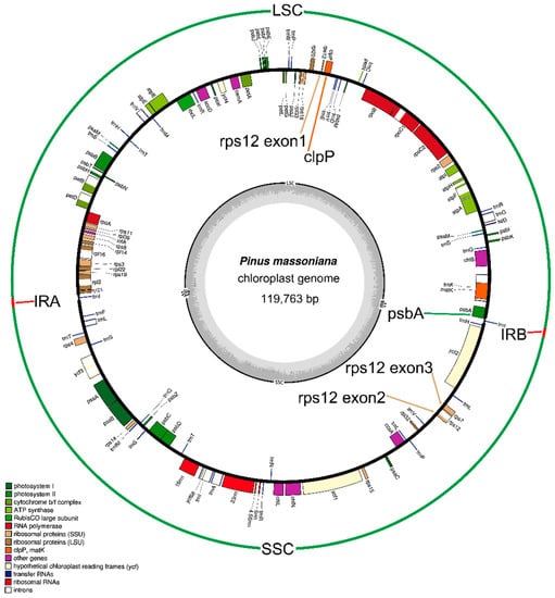 The LSC of the P. massoniana CPG contains 73 genes, including 17 tRNA genes and 56 PCGs. Additionally, 17 tRNA genes, 18 PCGs, and 4 rRNA genes are located in the SSC, while IRs only contain trnI-GAU, which is different from the species containing large IRs in their CPGs [31]. The boundary of the LSC-IRb is located in the psbA gene with 5′-psbA located in the LSC and 3′-psbA in the IR region. In addition, the PCGs trans-spliced across the boundary of the LSC and IR regions were in the CPGs in some other plants (e.g., rps12 of P. edulis [4] and Gentiana) [30], in which the exon1 of rps12 gene was observed in the LSC region, and the other two exons were in the IR regions. On the other hand, in the P. massoniana CPG, the 5′ exon of the rps12 gene was located in the LSC region, far from the other two remaining exons, which were observed in the SSC region because of the loss of large IRs in the P. massoniana CPG (Figure 1) [32].