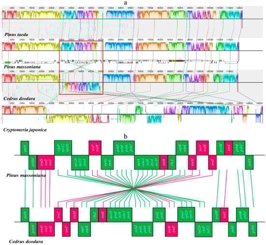 We compared P. massoniana organization with other conifers: P. taeda, Cedrus deodara, and Cryptomeria japonica. There were no structural variations between P. massoniana and P. taeda, while some inversions were observed among Pinus (P. massoniana and P. taeda), C. deodara, and C. japonica (Figure 2a). Figure 2a shows many structural variations between P. massoniana and C. japonica, but the former only showed one large inversion of 21,556 bp between the genes clpP and trnT-GGU in the LSC region based on a comparison with C. deodara [4]. The gene order in P. massoniana (clpP, rps12, rpl20, rps18, rpl33, psaJ, trnP, trnW, petG, petL, psbE, psbF, psbL, psbJ, petA, cemA, ycf4, psaI, accD, trnR, rbcL, atpB, atpE, trnM, trnV, trnH and trnT) changed to the inverted order in C. deodara (trnT, trnV, trnM, atpE, atpB, rbcL, trnR, accD, psaI, ycf4, cemA, petA, psbJ, psbL, psbF, psbE, petL, petG, trnW, trnP, psaJ, rpl33, rps18, rpl20 and clpP) (Figure 2b). Large IRs play important roles in stabilizing the CPGs against major structural variations, and the loss of large IRs could result in shorter intergenic spacers [6], more gene loss, and structural rearrangements [7,9]. Thus, the loss of the large IRs in the CPGs of P. massoniana and C. deodara may be the main cause of rearrangements in gene block order. The rearrangement of segments in CPGs are phylogenetically informative [4,6], and may be considered as useful tools in phylogenetic analyses.