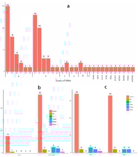Distribution of each simple sequence repeats (SSR) category in chloroplast genome (CPG) of Pinus massoniana. (a) Distribution of each SSR category in whole chloroplast genome; (b) Distribution of each SSR category in the coding sequence (CDS) and non-CDS of CPG; (c) Distribution of each SSR category in LSC and SSC of CPG.