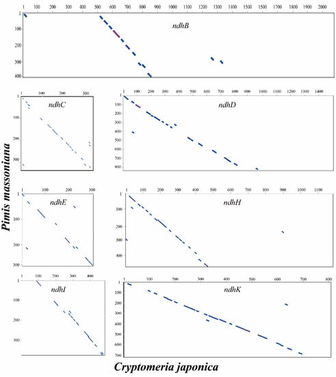 Dotpot analysis of seven ndh genes between P. massoniana and Cryptomeria japonica.