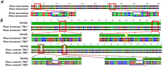 Variations of inverted repeats (IRs) using multiple alignment. (a) Variations between P. massoniana and P. taiwanensis; (b) variations between “IRa” and “IRb” in P. koraiensis and P. contorta. Variations are in red frames: Single Nucleotide Polymorphisms (SNPs) are in yellow frames; microsatellites are in blue frames.