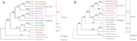 Phylogenetic tree constructed by maximum likelihood (ML) and Bayesian inference (BI) methods based on whole chloroplast genome sequences and 56 shared protein-coding genes of 16 conifers. (a) Phylogenetic tree based on whole chloroplast genome sequences of 16 conifers; (b) Phylogenetic tree based on 56 shared protein-coding genes of 16 conifers chloroplast genomes; Ginkgo biloba as an outgroup; BI posterior probability/ML bootstrap support values were listed at each node.