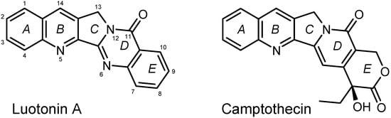 In search of new anticancer agents, structural modifications of the alkaloid Luotonin A (first isolated in 1997 []) have found considerable interest during the past two decades [,,,,,,,,,,]. Like its more prominent (and more potent) naturally occurring relative, Camptothecin (CPT) [,,], Luotonin A can act as a topoisomerase 1 poison by stabilizing the DNA/Topo1 complex [,]. Due to its aromatic E-ring (see Figure 1), Luotonin A is principally not associated with bladder toxicity which is a specific adverse effect of CPT-derived drugs like Topotecan or Irinotecan with their labile lactone structure as ring E []. On the other hand, the antineoplastic activity of the Luotonin A core structure is markedly lower than that of CPT [] and thus has stimulated efforts to improve topoisomerase 1 toxicity by various modifications of the lead structure.