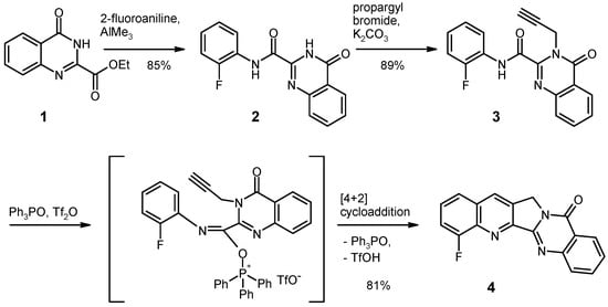 Among the four possible sites at ring A, position 4 (corresponding to position 8 of the quinoline core) appeared most interesting for the envisaged nucleophilic replacement of a fluorine atom with an amino substituent, as there have been several reports describing the preferential attack of nitrogen nucleophiles at this position in various di- and trifluoroquinolines [,,,]. We therefore commenced our investigations by preparing the hitherto unknown 4-fluoro derivative of Luotonin A via the pathway depicted in Scheme 1, starting from the quinazolinonecarboxylic acid ester 1 [,]. Weinreb amidation [] with 2-fluoroaniline/trimethylaluminium gave the N-arylamide 2 in good yield, selective propargylation at the quinazoline N-3 afforded the key intermediate 3. On treatment of the latter with bis(triphenyl)oxodiphosphonium triflate (Hendrickson’s reagent []) in dry dichloromethane at room temperature, an intramolecular [4+2] cycloaddition smoothly afforded the pentacyclic compound 4 in excellent overall yield.