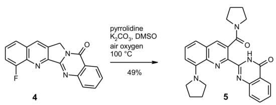 In order to achieve the desired nucleophilic fluorine substitution, we chose the conditions that had been described in the patent literature [,] for the reaction of 8-fluoroquinoline derivatives with various amines. Thus, the fluoro compound 4 was heated to 100 °C with an excess of pyrrolidine in dimethylsulfoxide (DMSO) solution in the presence of potassium carbonate. As indicated by TLC, the starting material was completely consumed after 24 h and a single new spot was observed. After evaporation of volatiles and extractive work-up, the crude product was purified by medium-pressure liquid chromatography to afford the new compound in 49% yield as red-coloured crystals. 1H-NMR-Spectroscopic characterisation surprisingly revealed the presence of two pyrrolidinyl residues in the molecule and the absence of the methylene unit that is part of ring C in the Luotonin A skeleton. On the other hand, the 13C-NMR spectrum showed an additional carbonyl resonance (besides the quinazolinone C=O group at 161.4 ppm) at lower field (168.6 ppm). Mass spectrometry (EI-MS (electron-impact ionization) and ESI-TOF (electrospray ionization, time-of-flight) high-resolution MS) indicated a molecular formula of C26H25N5O2. Based on the combined spectroscopic evidence, it can be concluded that (a) the expected nucleophilic substitution of the fluorine atom with pyrrolidine has indeed taken place and (b) the C-ring of the pentacyclic scaffold has undergone an oxidative ring opening, involving another pyrrolidine unit that is now attached to the quinoline core via an amide function (structure 5, Scheme 2).