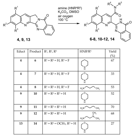 To explore the scope of this unexpected reaction, the fluoro compound 4 was reacted with other amines under the same conditions (100 °C, DMSO as solvent, and K2CO3 as a base). Interestingly, it turned out that only pyrrolidine is reactive enough to effect the fluorine substitution under these conditions, whereas piperidine, morpholine, and n-butylamine left the fluoro function untouched, but all led to the formation of ring-opened products with a (tertiary or secondary) carboxamide group (compounds 6–8, Scheme 3). An identical reaction behavior was found with the alkaloid Luotonin A itself (compound 9), affording the amides 10–12 on treatment with morpholine, n-butylamine, or N,N-dimethylethylenediamine, respectively. Also with the electron-rich 1,3-dimethoxy derivative [] of Luotonin A (compound 13), an analogous oxidative ring C opening was observed, furnishing the morpholide 14, albeit in moderate yield. All of the isolated carboxamides share some characteristic NMR properties such as the carbonyl resonance in the 13C-NMR spectra at 168–169 ppm (see supplementary material). The position of the secondary or tertiary amide function at C-3 of the quinoline nucleus is evidenced by HMBC (Heteronuclear Multiple Bond Correlation) crosspeaks between this carbonyl signal and the H-4 resonance as well as the NCH2 protons in the amide part. The spatial proximity between the latter two kinds of protons is further proven by a corresponding crosspeak in the NOESY (Nuclear Overhauser Effect Spectroscopy) spectrum. Additionally based on HSQC (Heteronuclear Single-Quantum Correlation) and COSY (Correlation Spectroscopy) experiments, all signals in the 1H- and 13C-NMR spectra could be assigned and are in full agreement with the proposed structures. As with compound 5, the molecular formulae of all new compounds were confirmed by [M + H]+ or [M + Na]+ peaks in the high-resolution ESI-TOF mass spectra.