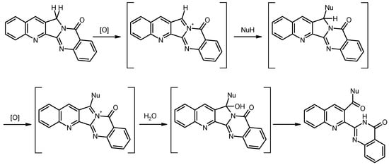 Proposed reaction mechanism for the oxidative/nucleophilic opening of ring C (NuH = primary or secondary amine).