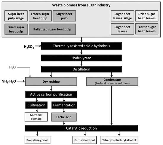67]. The advantages of the solution presented here include not only the value of the end products but also the fact it enables virtually “zero-waste” production. Currently, the sugar industry produces large amounts of waste biomass, only part of which can be only used without processing, as components in animal feed [