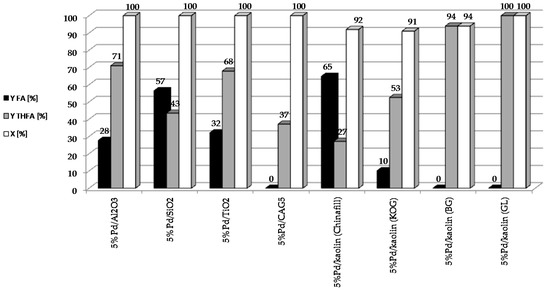42]. In our investigation, the process of furfural hydrogenation performed over palladium catalyst supported on various mineral carriers (Al