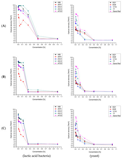 52]. In our research, the level of furfural in the hydrolysates following distillation did not exceed 0.16%. Despite this fact, an inhibitory effect was observed in some cultures. This can be explained by the synergistic action of several inhibitors. Combinations of different by-products can have synergistic inhibitory effects on the growth of yeast strains [