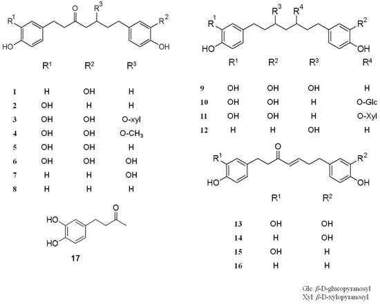 - Nomura, M.; Tokoroyama, T.; Kubota, T. Diarylheptanoids and other constituents from wood of Alnus japonica. Phytochemistry 1981, 20, 1097–1104. [Google Scholar] [CrossRef]