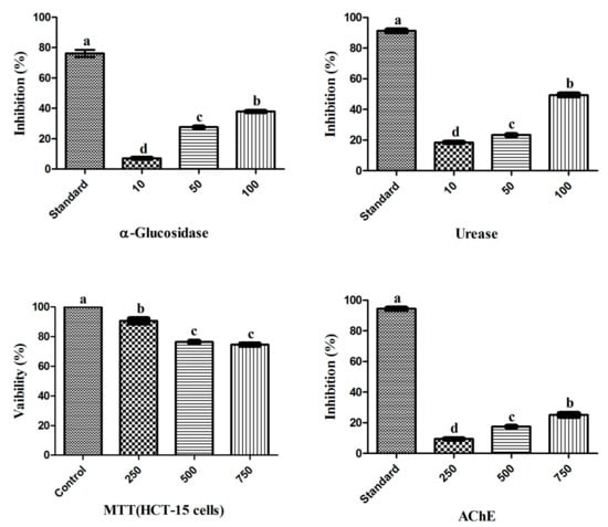 Biological potential of endophytic RWL-1 crude extract. The graph values are presented as the mean of three replicates with standard error. The acarbose, thiourea, DMSO and galantamine was used as reference standard for α-Glucosidase, Urease, MTT (HCT-15 cells) and AChE inhibition respectively. Bars with different letters are significantly different at p ≤ 0.05 based on Duncan multiple range test.