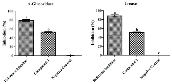 Inhibitory effects of compound 1 (100 µg mL−1) and reference inhibitors (80 µg mL−1) on α-glucosidase and urease. The graph values are standard error of means of three replications. The acarbose and thiourea was used as reference inhibitor for α-glucosidase and urease. Bars with different letters are significantly different at p ≤ 0.05 based on Duncan multiple range test.