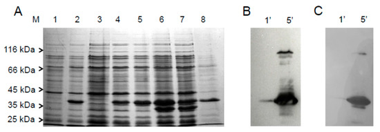 Over-expression and identification of recombinant hFADS6. (A) Proteins were separated by SDS–PAGE (Sodium Dodecylsulfate-Polyacrylamide Gel Electrophoresis) on 12% T polyacrylamide gel and stained with Coomassie Blue. Lane M: molecular mass markers: beta-galactosidase (116 kDa), bovine serum albumin (BSA) (66 kDa), ovalbumin (45 kDa), lactate dehydrogenase (35 kDa), restriction endonuclease Bsp98I (25 kDa); lane 1, non-induced cell lysate after 2 h of growth (6 µg); lane 2, cell lysate after 2 h of induction (8 µg); lane 3, soluble fraction of non-induced cell lysate after 2 h of growth (10 µg); lanes 4–6, soluble fractions of cell lysate after 2 h, 4 h and 8 h of 0.1 mM isopropyl β-d-1-thiogalactopyranoside (IPTG) induction at 28 °C, (12, 14 and 15 µg) respectively; lane 7, soluble fractions of cell lysate after 8 h of 0.1 mM IPTG induction at 20 °C (13 µg); lane 8, insoluble fraction of cell lysate after 4 h of 0.1 mM IPTG induction at 28 °C (7 µg); (B) Immunoblotting of hFADS6: lanes 1′ and 5′, immunodetection on the same protein fractions as in (A) with anti-FADS antiserum (1:2500); (C) lanes 1′ and 5′, immunodetection on the same protein fractions as in (A) with anti-His antibody (1:40,000). The molecular mass markers in (B,C) were as in (A).