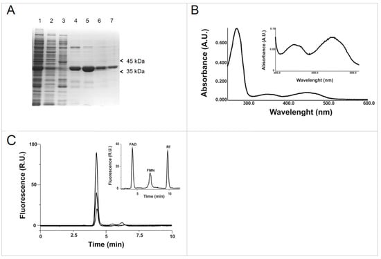 - Galluccio, M.; Brizio, C.; Torchetti, E.M.; Ferranti, P.; Gianazza, E.; Indiveri, C.; Barile, M. Over-expression in Escherichia coli, purification and characterization of isoform 2 of human FAD synthetase. Protein Expr. Purif. 2007, 52, 175–181. [Google Scholar] [CrossRef] [PubMed]