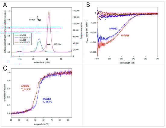 The aggregation state of hFADS6 and of hFADS2 was assessed by size exclusion chromatography and hydrodynamic radius measurement performed by tandem HPLC-GPC/LS. As shown in Figure 4A, hFADS6 migrated in HPLC-GPC as a single peak with an elution volume of 13 mL, much higher than what observed for hFADS2 (elution volume, 11 mL). The addition of 1 mM DTT to the elution buffer did not alter the chromatographic behavior of either protein, if not for improving the sharpness of individual peaks, likely because of the dissociation of minor amounts of disulfide linked aggregates. Online MALS (Multi-Angle Light Scattering) measurements performed on the peaks obtained in the presence of DTT gave molecular masses of 36.5 ± 5 kDa for hFADS6 and 111 ± 17 kDa for hFADS2, confirming that the hFADS6 and the hFADS2 had a monomeric and dimeric nature, respectively.
