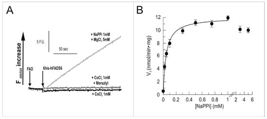 Fluorimetric evidence for FAD cleavage as catalyzed by 6-His–hFADS6. (A) Fluorimetric evidence of FAD cleavage. The reaction was measured in 50 mM Tris/HCl, pH 7.5, containing 0.5 µM FAD and 1 mM NaPPi, at 37 °C, in the presence of 5 mM MgCl2 (light grey). The FAD cleavage reaction (i.e., pyrophosporolysis) was started by the addition of the 6-His-hFADS6 protein (0.13 µM) and was measured by the initial rate of fluorescence increase (λ excitation = 450 nm, λ emission = 520 nm). FAD hydrolysis was measured under the same conditions, if not for omitting NaPPi and MgCl2, and in the presence of either 1 mM CoCl2 (black line) or 1 mM CoCl2 plus 0.5 mM Mersalyl (dark grey); (B) NaPPi concentration dependence. FAD cleavage (i.e., pyrophosporolysis) rate, catalyzed by purified 6-His–hFADS6 (0.13 µM), was measured fluorimetrically at 37 °C in 2 mL of 50 mM Tris/HCl pH 7.5, in the presence of 5 mM MgCl2, 0.5 µM FAD, and of the given NaPPi concentrations.