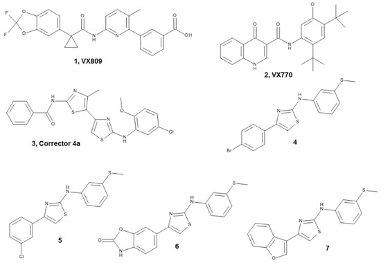 To solidly validate the complementary approach made up by computational and SPR studies, here we have investigated the interaction of three well characterized and promising CF correctors and four new potentially interesting compounds (Figure 1) [22,23,24,25,26] and characterized their ability to bind to ΔF508-NBD1.