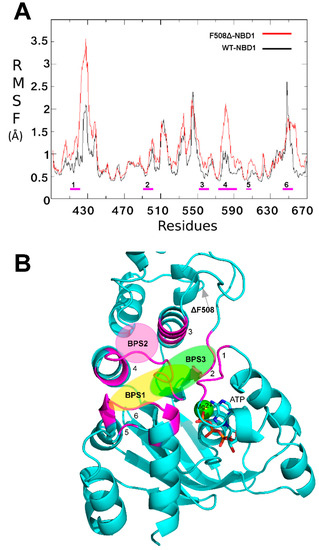 Several studies demonstrated that the ΔF508-NBD1 apo is thermodynamically and kinetically destabilized at physiological temperature in respect to the WT NBD1 apo [27,28,29]. In order to highlight which differences in structure and backbone flexibility were induced in the protein by the mutation, we firstly focused our attention on exhaustive MDS studies of 200 ns on both WT NBD1 and ΔF508-NBD1 forms. In agreement with literature data [30,31] a very high flexibility was observed for ΔF508-NBD1 in comparison to the WT NBD1, that was not limited to the close environment of the ΔF508 residue (Figure 2A).