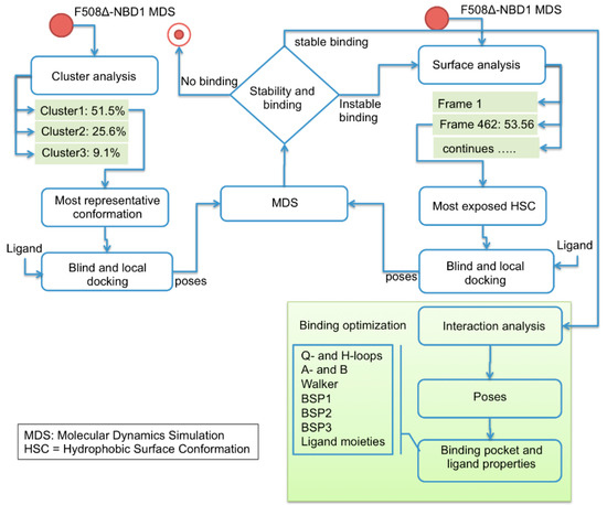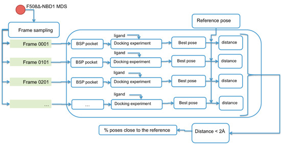 We implemented a protein pocket dataset that includes the three pockets (BSP1, BSP2, BSP3) obtained from the workflow illustrated in Figure 3, and performed docking analysis of each pocket against a selection of 1000 time-equidistant frames along the MDS of the ΔF508-NBD1 (one each 200 ps). The computations were carried out using local docking with Auto-Dock Vina. For each ligand/ΔF508-NBD1 docking simulation, the lowest energy complex was identified and for each ligand, all docked poses over the 1000 frames were grouped by similar ligand-pocket distance between the docking pose and the reference pose, the latter obtained considering the most frequent cluster of the dynamic of the complex. The results were then compared to the mean value of the binding energy of the group, allowing the evaluation of the number of ΔF508-NBD1 conformations able to bind to each compound (Table S2).