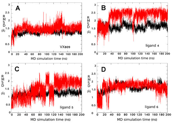 Analysis of putative binding mode stability. RMSD along simulation time for the ΔF508-NBD1/ligand complexes calculated with respect to the most representative conformation of the ΔF508-NBD1/ligand trajectory obtained from cluster analysis. The ligand and the ΔF508-NBD1 RMSD are depicted in red and in black, respectively. (A) VX809; (B) ligand 4; (C) ligand 5; (D) ligand 6.