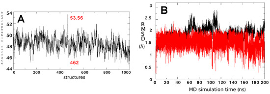 (A) Fluctuation of the hydrophobic surface area of ΔF508-NBD1 calculated considering 1000 equidistant structures along its dynamics (one each 200 ps). The frame number 462 with the most exposed hydrophobic surface used for compound 5 docking studies and 53.56, the value corresponding to its hydrophobic surface in Å2, are indicated in red; (B) RMSD of atomic loci along the MDS trajectory of the ΔF508-NBD1/compound 5 complex calculated in respect to the frame number 462 and plotted against simulation time. Black and red lines refer to ΔF508-NBD1 backbone and ligands, respectively. All structure indices in x-axis must be multiplied by 1000 to obtain the frame index.