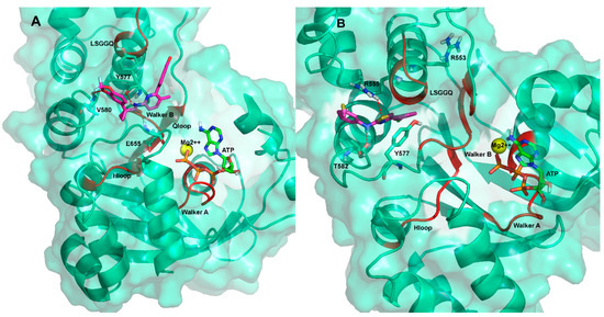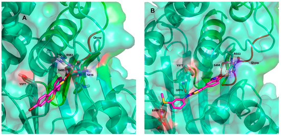 Binding of compound 5 seems to occur in another NBD1 sub-pocket (BSP2) via a network of H-bonds: one between the sulphur atom of the AAT ring and R555, a very important residue of the RXR motif [33], another between the hydrogen of the aminic nitrogen of compound 5 and T582. Also, a π-π interaction between the thiazolic ring of the AAT and Y577 seems to occur that further stabilizes the interaction (Figure 6B and Supplementary Materials, Figure S6).