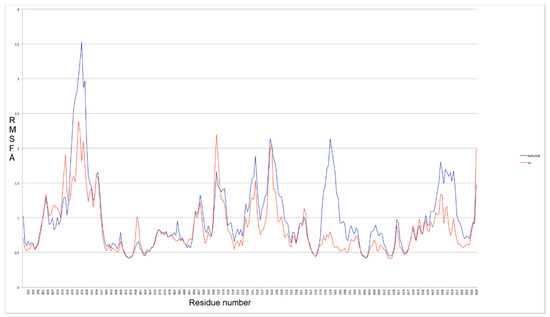 In addition, the RMSF profiles obtained from our VX809 binding pose, selected by docking and followed by MDS, show an attenuation of the fluctuation along almost all regions in ∆F508-NBD1 when compared with the WT protein (Figure 8). This result is in agreement with literature data reporting reduced fluctuations induced by VX809 in 499-502 and 539-542 regions near ICL3 of ∆F508-NBD1 [35].