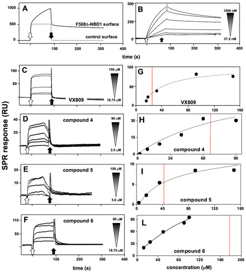Blank subtracted values of RU bound at equilibrium obtained from injections of increasing concentrations of the various putative CF drugs on ΔF508-NBD1 were then used to build the curves reported in Figure 9E–H: VX809, compounds 5 and 4 bind to ΔF508-NBD1 in a dose-dependent and saturable manner, with Kd values ranging between 24.2 ± 6.2 and 99.3 ± 14.5 μM. At the concentrations tested, compound 6 shows no saturable binding, with a presumed Kd value equal to 197.9 ± 4.5 μM (Table 1).