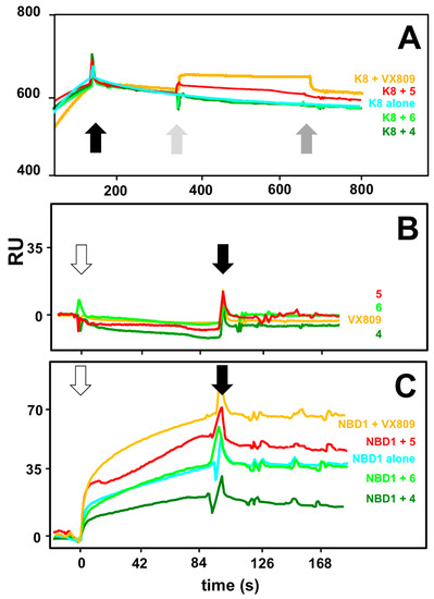 In conclusion, the in-tandem approach made up of in silico studies and SPR analysis points to different binding modes (and different binding affinity) for VX809 and the various AATs that, in turn, indicate two potential rescue mechanisms: the first consisting in the capacity of the compound (i.e., VX809 and compound 5) to stabilize the conformational variability of NBD1, the second consisting instead in the capacity of the compound (i.e., compound 4 and possibly compound 6) to interfere with the binding of K8 to ΔF508-NBD1.