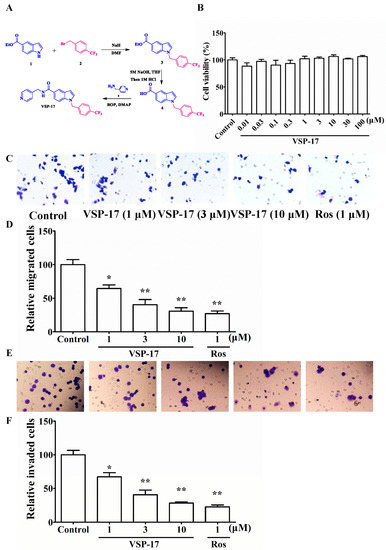 Synthesis of VSP-17 and effect of VSP-17 on MDA-MB-231 cell migration and cell invasion. (A) Synthesis of VSP-17; (B) Effect of VSP-17 on MDA-MB-231 cell viability; (C,D) Effect of VSP-17 on MDA-MB-231 cell migration. Cell migration was detected by using cell migration assay; (E,F) Effect of VSP-17 on MDA-MB-231 cell invasion. MDA-MB-231 cells were cultured in chambers with matrigel followed by treatment with VSP-17 (1, 3, 10 μM) for 24 h. The number of cells invaded through the matrigel of chambers bottom were counted in three different regions. The data were expressed as the means ± S.E.M. of three independent experiments. * p < 0.05, ** p < 0.01 vs. control.
