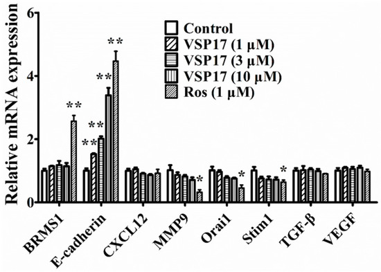The migration and the invasion processes of tumor cells can be regulated by many factors, such as BRMS1, E-cadherin, CXCL12, MMP9, Orai1, Stim1, TGF-β, and VEGF [22,23,24,25,26,27,28]. To identify the mechanisms in anti-migration and anti-invasion effect of VSP-17, the expression of migration and invasion-associated factors above were studied. As shown in Figure 2, VSP-17 (1, 3, and 10 μM) upregulated the mRNA expression of E-cadherin in a concentration-dependent manner in MDA-MB-231 cells. In contrast, VSP-17 showed a slight effect on the mRNA expression of BRMS1, CXCL12, Orai1, Stim1, TGF-β, and VEGF in MDA-MB-231 cells. These results suggested that E-cadherin might play a vital role in the VSP-17-mediated inhibition of migration and invasion in MDA-MB-231 cells.