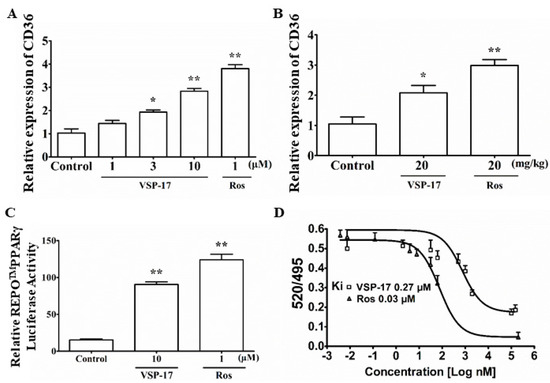 Effect of VSP-17 on the activation of PPARγ. (A) Effect of VSP-17 on the expression of CD36 in MDA-MB-231 cells. The cells were treated with VSP-17 (1, 3, 10 μM) and rosiglitazone (1 μM) for 24 h. The mRNA expression of CD36 was detected using Q-PCR analysis; (B) Effect of VSP-17 on the expression of CD36 in MDA-MB-231 xenograft model. Mice were injected with MDA-MB-231 cells at the left and right mammary fat pads and then treated with VSP-17 (20 mg/kg) and rosiglitazone (20 mg/kg) for five weeks. Tumor samples from the breasts of mice were collected at the end of five weeks and subjected to Q-PCR analysis for CD36 expression; (C) Effect of VSP-17 on PPARγ reporter gene activity. MDA-MB-231 cells were transiently transfected with REPOTMPPARγ and then subjected to indicated treatments for 24 h. Cells were then harvested and assayed for luciferase activity. Rosiglitazone is an agonist of PPARγ. GW9662 is the antagonist of PPARγ; (D) Binding of VSP-17 to PPARγ-LBD in a competitive TR-FRET assay. Data were expressed as means ± S.E.M. of three independent experiments. * p < 0.05 vs. control, ** p < 0.01 vs. control.