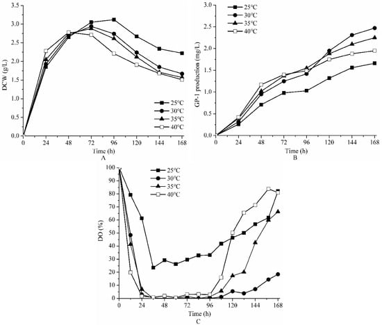 The time course of GP-1 production are illustrated in Figure 1B. In logarithmic phase, GP-1 began to be synthesized and was excreted quickly with cell growth. After a low production rate in stationary phase, GP-1 was largely accumulated in the fermentation broth due to gradual cell death during the decline phase. GP-1 production initially increased with the increase of temperature. After 72 h, the higher temperature of 35 and 40 °C accelerated enzyme inactivation and cell senescence, resulting in a reduction of the GP-1 production rate. The final GP-1 production from 25 to 40 °C were 1.66, 2.47, 2.25 and 1.95 mg/L, respectively (Table 1).