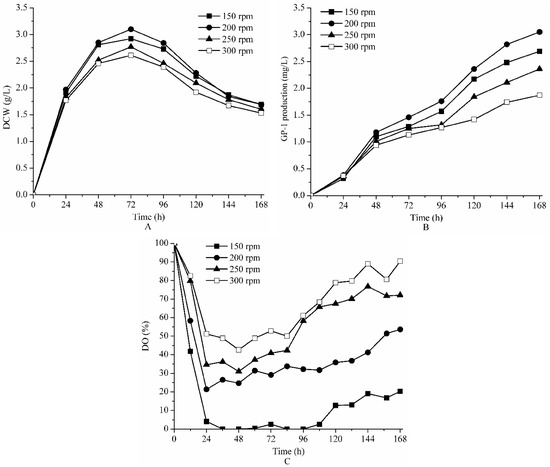 The effect of agitation speed on DCW (A); GP-1 production (B) and DO (C) during batch fermentation of Streptomyces kanasenisi ZX01 in 5 L fermentor.