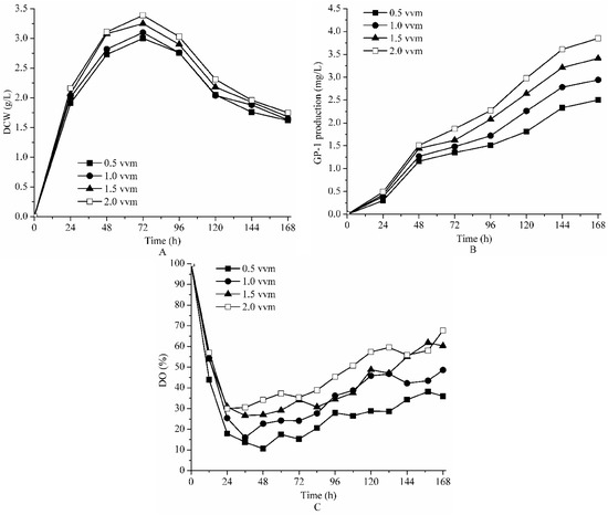 The effect of aeration rate on DCW (A); GP-1 production (B) and DO (C) during batch fermentation of Streptomyces kanasenisi ZX01 in a 5 L fermentor.