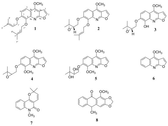 - Khalid, S.A.; Waterman, P.G. Furoquinoline and pyrano-2-quinolone alkaloids of Vepris stolzii. J. Nat. Prod. 1982, 45, 343–346. [Google Scholar] [CrossRef]