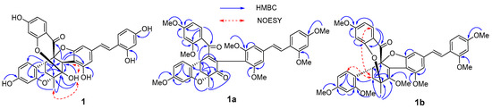 Key correlations of compounds 1, 1a, and 1b in HMBC and NOESY spectra.