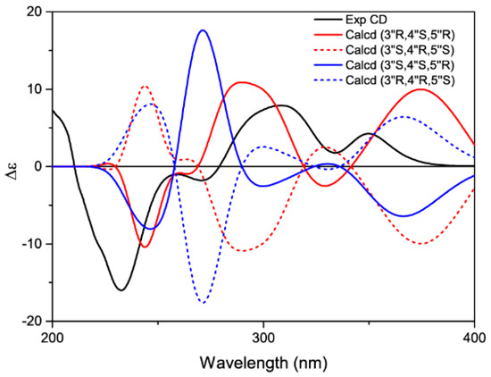 Because the two bridged rings on C1″/C5″ and C2″/C4″ were adjacent to each other, they must be on opposite sides of the hexane plane. Thus, the orientation of C-3″ yielded two sets of epimers—cis-trans or all-trans, in agreement with the biosynthesis pathway [17] of the D-A adducts in the genus Morus. Although the benzyl carbonyl of 1 was coplanar with the aromatic ring, its CD (Circular Dichroism) spectrum did not show the split Cotton effects typical of non-O-bridged D-A adducts, such as mulberrofurans C and J [16]. Two positive Cotton effect peaks at 349 nm and 308 nm were observed, in accordance with the calculated ECD (Electronic Circular Dichroism) spectrum (Figure 4) of one 3″H-α epimer—i.e., (3″R, 4″S, 5″R)—by using the TDDFT (Time-Dependent Density Functional Theory) method. Therefore, the absolute configuration of 1 was determined to be (1″R, 2″R, 3″R, 4″S, 5″R).