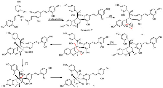 The genus Morus is a plant source with rich D-A adducts. More than 50 D-A adducts have been found in the previous studies [18]. However, a natural product with a highly oxygenated D-A skeleton is rarely reported [19]. A plausible biosynthetic pathway for 1 was postulated in Figure 5, based on the KEGG pathway prediction. Kuwanon Y, a D-A adduct found in genus Morus [16], afforded 1 through three oxidization steps. First, the double bond of the D-A skeleton was oxidized to an epoxide by an oxidase [20] or putative Cyt P450 monooxygenase [19], then the epoxide was attacked by 16″-OH at C-1″, and 2″-OH was formed. Sequentially, the newly formed 2″-OH was oxidized to a carbonyl by an oxidoreductase [21] and was attracted by 10″-OH to form a hemiketal [22]. Finally, the α-position of the 8″-carbonyl was oxidized to form an electrophilic center and was trapped by 5′-OH [23] to afford 1.