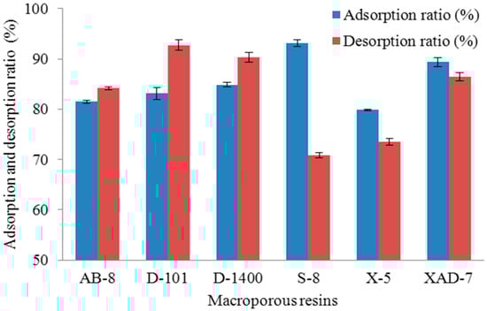 Six macroporous resins with different adsorption capacity and desorption capacity were investigated for the separation and purification of chokeberry polyphenols. The results are presented in Figure 1. S-8 resin and XAD-7 resin showed a stronger adsorption capacity for chokeberry polyphenols than other adsorbents and D101 resin, D1400 resin and XAD-7 resin showed higher desorption ratios than the others, while S-8 resin showed the lowest desorption ratio and it can’t effectively desorb polyphenols. D101 resin and D1400 resin showed a lower adsorption capacity than XAD-7 resin, respectively.