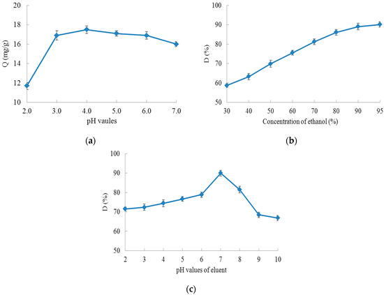 Static adsorption and desorption of XAD-7 resin: (a) is the effect of extract pH value on adsorption capacity; (b) is the effect of ethanol concentration on desorption ratio; (c) is the effect of eluent pH value on desorption ratio. (Q (mg/g) is the adsorption capacity; D (%) is the desorption ratio.).