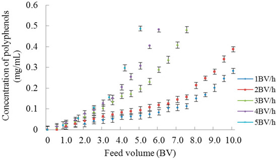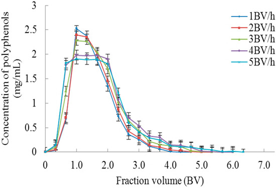 The dynamic desorption curve was drawn based on the volume of eluent and the concentration of polyphenols therein at different flow rates. Ethanol (55%, v/v) was used for elution of polyphenols by maintaining the flow rates at 1, 2, 3, 4 and 5 BV/h. As shown in Figure 6, as the eluent flow rate increases, the dynamic desorption curve peak broadens, and the tailing phenomenon becomes more obvious, resulting in increased elution volume. Hence a lower elution flow rate is conducive to elution of chokeberry polyphenols but the elution flow rate is too slow, so the elution time will be increased accordingly. Therefore, 2 BV/h was selected as the optimal elution flow rate. It can be seen from the figure that approximately 5 BV eluent could completely elute the chokeberry polyphenols from the XAD-7 resin at a flow rate of 2 BV/h.