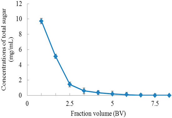 As the chromatography column contains a large amount of non-adsorbed polyphenols and saccharides, it was rinsed with deionized water to remove the impurities. As shown in Figure 5, with the increase of the amount of deionized water elution, the concentrations of total sugar in the effluent decreased significantly. When the amount of deionized water used reached 4.2 BV, the effluent became colorless, indicating that non-adsorbed products had been effectively removed.