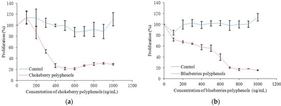 The antiproliferative activity of polyphenols from chokeberry, blueberries, haskap berries were determined using a previously reported method from the Liu lab [30]. Briefly, HepG2 cells at concentrations of 2.5 × 104/well in the growth media were placed in each well of a 96-well flat-bottom plate and were incubated at 37 °C in 5% CO2 to allow cells to attach sufficiently. Then the growth medium was removed, and the cells were washed once with 100 μL sterile cold PBS. Afterwards, the HepG2 cells were treated with various concentrations of purified polyphenols (chokeberry, blueberries and haskap) in growth medium. Control cultures received the polyphenols solution minus the polyphenols and blank wells contained 100 μL of growth medium without HepG2 cells. At least three replicates were performed for each sample. Then the cells were incubated at 37 °C in 5% CO2 again for 72 h. The HepG2 cells were stained and assayed by the methylene blue method. Absorbance was measured at 570 nm using a microplate reader. The percentage of cell proliferation was calculated by absorbance of each concentration polyphenols compared to the control. The antiproliferative activity was expressed as an IC50 value.