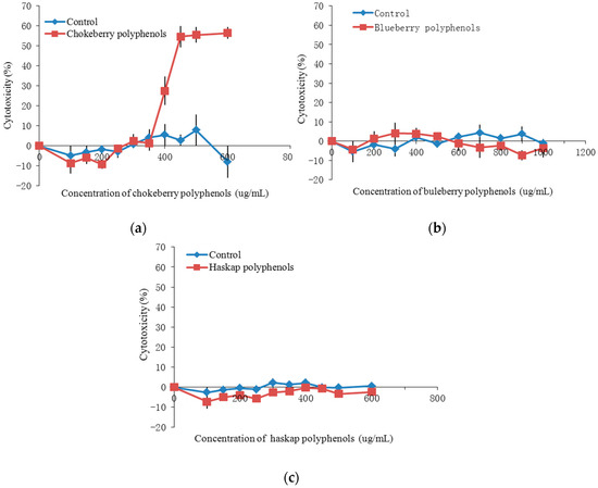 Cytotoxicity of polyphenols from chokeberry (a); blueberry (b); haskap (c) berries.