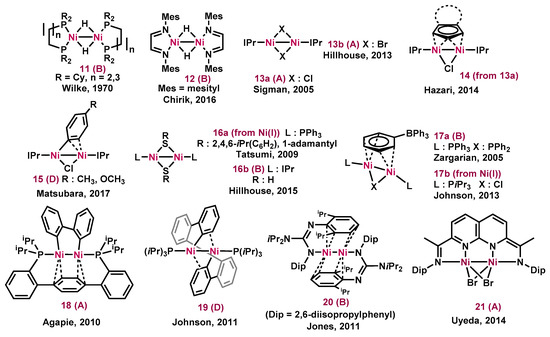 - Beck, R.; Johnson, S.A. Dinuclear Ni(I)-Ni(I) complexes with syn-facial bridging ligands from Ni(I) precursors or Ni(II)/Ni(0) comproportionation. Organometallics 2013, 32, 2944–2951. [Google Scholar] [CrossRef]