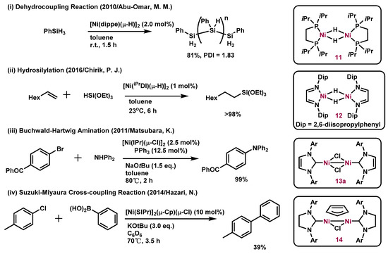 - Smith, E.E.; Du, G.; Fanwick, P.E.; Abu-Omar, M.M. Dehydrocoupling of organosilanes with a dinuclear nickel hydride catalyst and isolation of a nickel silyl complex. Organometallics 2010, 29, 6527–6533. [Google Scholar] [CrossRef]