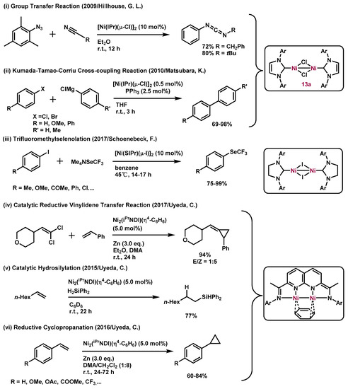 - Uyeda, C.; Steiman, T.J.; Pal, S. Catalytically active nickel-nickel bonds using redox active ligands. Synlett 2016, 27, 814–820. [Google Scholar] [CrossRef]