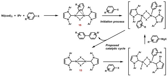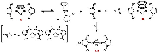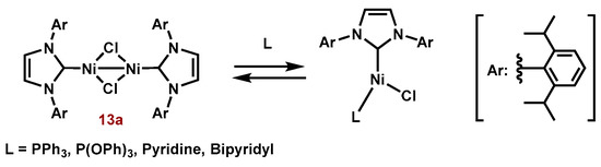 - Ho, N.K.T.; Neumann, B.; Stammler, H.G.; Menedes da Silva, V.H.; Watanabe, D.G.; Braga, A.A.C.; Ghadwal, R.S. Nickel-catalysed direct C2-arylation of N-heterocyclic carbenes. Dalton Trans. 2017, 46, 12027–12031. [Google Scholar] [CrossRef] [PubMed]
